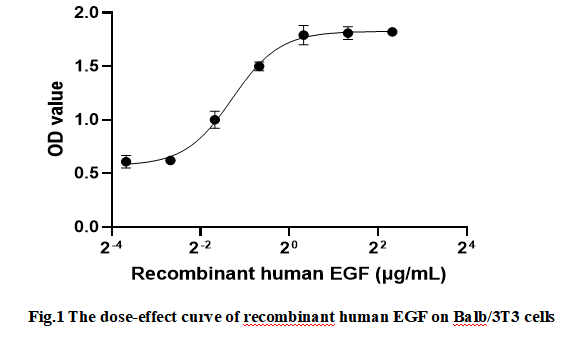 Epidermal Growth Factor (EGF) is the founding member of the EGF-family of proteins. Members of this protein family have highly similar structural and functional characteristics. Members of the EGF family are characterized by a shared structural motif, the EGFlike domain, which contains three intramolecular disulfide bonds that are formed by six similarly spaced, conserved cysteine residues. EGF is a growth factor that stimulates cell growth, proliferation, and differentiation by binding to its receptor EGFR. To test the effect of EGF on cell proliferation, Balb/3T3 cells were seeded into triplicate wells of 96-well plates and allowed to attach overnight, then the medium was replaced with various concentrations of recombinant human EGF with serum-free standard DMEM. After incubated for 72h, cells were observed by inverted microscope and cell proliferation was measured by Cell Counting Kit-8 (CCK-8). Briefly, 10 µl of CCK-8 solution was added to each well of the plate,then measure the absorbance at 450 nm using a microplate reader after incubating the plate for 1-4 hours at 37 °C. The dose-effect curve of EGF was shown in Figure 1. It was obvious that EGF significantly increased cell viability of Balb/3T3 cells. The EC50 is 0.411 μg/mL.
