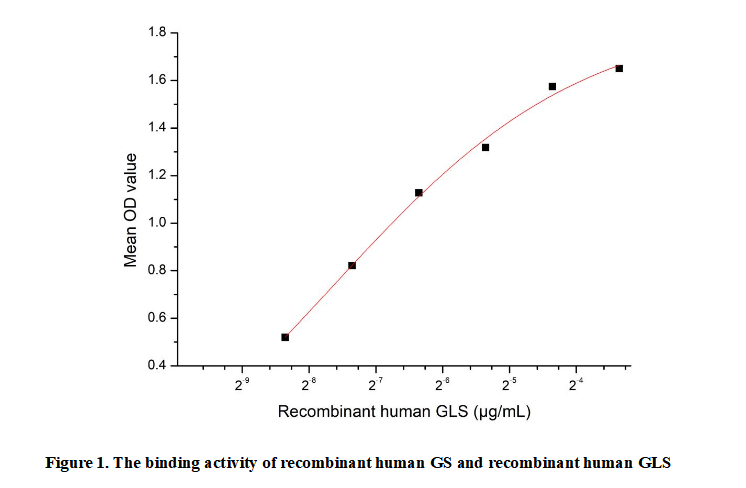 Glutamine synthetase (GS), encoded by the GLUL gene, is a key enzyme in nitrogen metabolism that catalyzes the ATP-dependent conversion of glutamate and ammonia into glutamine. Widely expressed in tissues like the liver, brain, and kidneys, it maintains nitrogen homeostasis—detoxifying ammonia in the liver and supporting neurotransmitter synthesis in the brain. GS also plays a critical role in cancer metabolism, as rapidly dividing tumor cells rely on glutamine for energy and biosynthesis. GS and GLS (glutaminase) function in a cyclic relationship: GLS breaks down glutamine into glutamate, which GS then uses to resynthesize glutamine, though they do not directly bind physically.To detect the activity of recombinant GS , a functional ELISA assay was performed to evaluate the interaction between recombinant human GS and recombinant human GLS.Briefly, GLS was diluted serially in PBS with 0.01% BSA (pH 7.4). Duplicate samples of 100 μl were then transferred to GS-coated microtiter wells and incubated for 1h at 37℃. Wells were washed with PBST and incubated for 1h with anti-GLS pAb, then aspirated and washed 3 times. After incubation with HRP labelled secondary antibody for 1h at 37℃, wells were aspirated and washed 5 times. With the addition of substrate solution, wells were incubated 15-25 minutes at 37℃. Finally, add 50 µL stop solution to the wells and read at 450/630nm immediately.Measured by its binding ability in a functional ELISA. When Recombinant GS is lmmobilized at 2 µg/mL(100 uLwell), the concentration of GLS that produces 50% optimal bindingresponse is found to be approximately 0.00494 µg/mL.