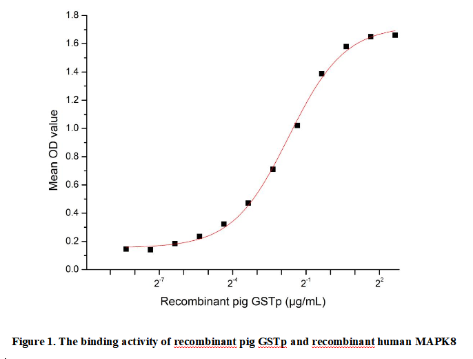 Glutathione S Transferase Pi (GSTp) is a key member of the GST enzyme family, widely expressed in mammalian tissues like the liver, kidneys, and lungs. It primarily functions in cellular detoxification, catalyzing the conjugation of glutathione to electrophilic xenobiotics and endogenous reactive species, facilitating their excretion. Beyond detoxification, GSTp also regulates cellular signaling and stress responses—for instance, it modulates oxidative stress by scavenging free radicals and interacts with signaling molecules to influence cell survival. Structurally, it exists as a homodimer, with each subunit containing a glutathione-binding site and a substrate-binding site, enabling its enzymatic and regulatory roles. GSTp specifically binds to Mitogen Activated Protein Kinase 8 (MAPK8), inhibiting MAPK8’s kinase activity to regulate stress and apoptotic pathways.To detect the activity of recombinant GSTp a functional ELISA assay was performed to evaluate the interaction between recombinant pig GSTp and recombinant human MAPK8.Briefly, GSTp was diluted serially in PBS with 0.01% BSA (pH 7.4). Duplicate samples of 100 μl were then transferred to MAPK8-coated microtiter wells and incubated for 1h at 37℃. Wells were washed with PBST and incubated for 1h with anti-GSTp pAb, then aspirated and washed 3 times. After incubation with HRP labelled secondary antibody for 1h at 37℃, wells were aspirated and washed 5 times. With the addition of substrate solution, wells were incubated 15-25 minutes at 37℃. Finally, add 50 µL stop solution to the wells and read at 450/630nm immediately. The binding activity of recombinant pig GSTp and recombinant human MAPK8 was shown in Figure 1, the EC50 for this effect is 0.31µg/mL.