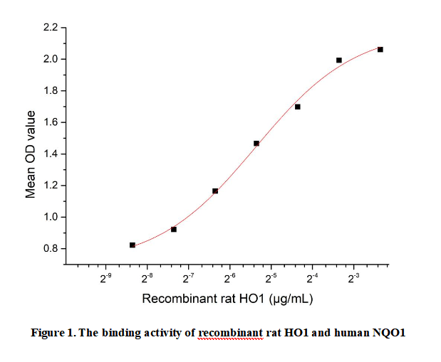 Heme Oxygenase 1 (HO1) is a stress-inducible rate-limiting enzyme in heme catabolism, catalyzing heme degradation into carbon monoxide, biliverdin and free iron. As a critical cytoprotective protein, it is upregulated by oxidative stress, inflammation and hypoxia, exerting anti-oxidative, anti-inflammatory and anti-apoptotic effects by scavenging reactive oxygen species and regulating iron homeostasis. HO1 is widely expressed in the liver, spleen and vascular tissues, and its dysregulation is associated with cardiovascular diseases, neurodegeneration, cancer and metabolic disorders, making it a promising therapeutic target for oxidative stress-related pathologies. It also modulates immune responses and tissue repair by regulating macrophage polarization and endothelial cell function. HO1 and NQO1 are co-induced by Nrf2, forming a synergistic antioxidant defense network to enhance cellular stress resistance. Briefly, NQO1 was diluted serially in PBS with 0.01% BSA (pH 7.4). Duplicate samples of 100 μL were then transferred to HO1-coated microtiter wells and incubated for 1h at 37℃. Wells were washed with PBST and incubated for 1h with anti-NQO1 pAb, then aspirated and washed 3 times. After incubation with HRP labelled secondary antibody for 1h at 37℃, wells were aspirated and washed 5 times. With the addition of substrate solution, wells were incubated 15-25 minutes at 37℃. Finally, add 50 µL stop solution to the wells and read at 450/630nm immediately. Measured by its binding ability in a functional ELISA. When Recombinant rat HO1 is lmmobilized at 2 µg/mL(100 µLwell), the concentration of NQO1 that produces 50% optimal bindingresponse is found to be approximately 0.024 µg/mL.