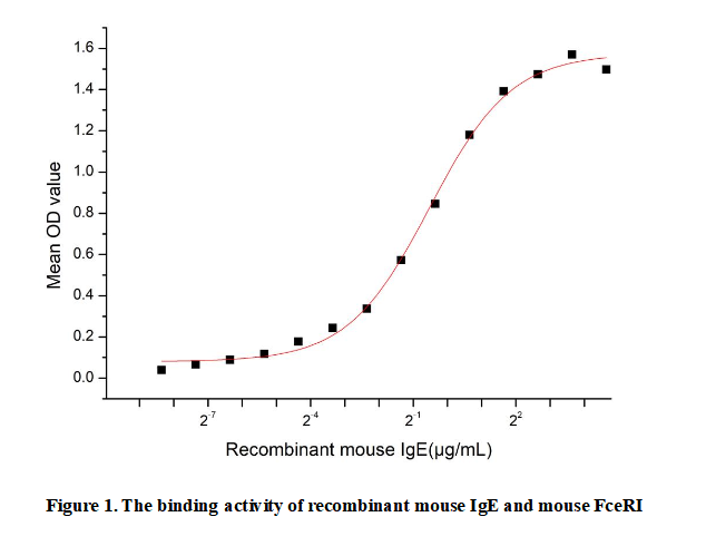 Immunoglobulin E (IgE) is one of the members the 5 classes of immunoglobulins (IgM, IgG, IgD, IgA, IgE).It is produced by plasma cells and accounts for less than 0.01% of the total immunoglobulin.IgE has a unique chemical structure and various physiological functions, such as type I hypersensitivity reactions, parasitic infections, autoimmune processes, and venom protection. Besides,IgE binds to Receptor I For The Fc Region Of Immunoglobulin E (FceRI) on mast cells and basophils via its Fc - region, triggering signal transduction, thus a functional binding ELISA assay was conducted to detect the interaction of recombinant human IgE and recombinant human FceRI.Briefly, IgE was diluted serially in PBS with 0.01% BSA (pH 7.4). Duplicate samples of 100 μl were then transferred to FceRI-coated microtiter wells and incubated for 1h at 37℃. Wells were washed with PBST and incubated for 1h with anti-IgE pAb, then aspirated and washed 3 times. After incubation with HRP labelled secondary antibody for 1h at 37℃, wells were aspirated and washed 5 times. With the addition of substrate solution, wells were incubated 15-25 minutes at 37℃. Finally, add 50 µL stop solution to the wells and read at 450/630nm immediately. The binding activity of recombinant human IgE and recombinant human FceRI was shown in Figure 1, the EC50 for this effect is 0.69ug/mL.