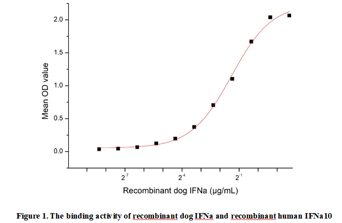 Interferon Alpha (IFNa) is a cytokine belonging to the type I interferon family, primarily produced by plasmacytoid dendritic cells and other immune cells in response to viral infections. It functions as a critical mediator of innate immunity by binding to the interferon-alpha receptor (IFNAR) complex, activating the JAK-STAT signaling pathway. This induction leads to the expression of interferon-stimulated genes (ISGs), which establish an antiviral state in cells, inhibit viral replication, and modulate immune responses. IFNa also exhibits antitumor and immunoregulatory properties and is used therapeutically against viral infections and certain cancers.Besides,Interferon Alpha 10 (IFNa10) has been identified as an interactor of IFNa, thus a functional binding ELISA assay was conducted to detect the interaction of recombinant dog IFNa and recombinant human IFNa10 .Briefly, biotin-linked IFNa were diluted serially in PBS, with 0.01% BSA (pH 7.4). Duplicate samples of 100µl were then transferred to IFNa10-coated microtiter wells and incubated for 1h at 37℃. Wells were washed with PBST 3 times and incubation with Streptavidin-HRP for 30min, then wells were aspirated and washed 5 times. With the addition of substrate solution, wells were incubated 15-25 minutes at 37℃. Finally, add 50µl stop solution to the wells and read at 450nm immediately. The binding activity of IFNa and IFNa10 was shown in Figure 1, the EC50 for this effect is 0.38 µg/mL.