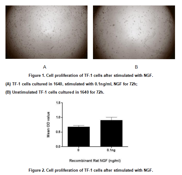 Nerve growth factor (NGF) is a neurotrophic factor and neuropeptide primarily involved in the regulation of growth, maintenance, proliferation, and survival of certain target neurons. NGF is also involved in pathways besides those regulating the life cycle of neurons. a nerve growth factor (NGF)-dependent TF-1 subclone cell line suitable for determination of bioactivity of recombinant NGF(rhNGF), then TF-1 cells were seeded into triplicate wells of 96-well plates at a density of 5,000 cells/well with 1% serum standard 1640 contain various concentrations of recombinant rat NGF. After incubated for 72h, cells were observed by inverted microscope and cell proliferation was measured by Cell Counting Kit-8 (CCK-8). Briefly, 10µL of CCK-8 solution was added to each well of the plate, then the absorbance at 450nm was measured using a microplate reader after incubating the plate for 1-4 hours at 37℃. Proliferation of TF-1 cells after incubation with TF-1 for 72h observed by inverted microscope was shown in Figure 1. Cell viability was assessed by CCK-8 assay after incubation with recombinant NGF for 72h. The result was shown in Figure 2. It was obvious that NGF significantly increased cell viability of TF-1 cells.