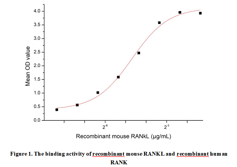 Receptor Activator of Nuclear Factor Kappa B Ligand (RANKL) is a key cytokine belonging to the TNF superfamily, primarily produced by osteoblasts, activated T cells, and bone marrow stromal cells. It plays a pivotal role in osteoclast differentiation, bone remodeling, and immune regulation by binding to its receptor RANK. RANKL exists in both membrane-bound and soluble forms, with the membrane-bound form exhibiting stronger biological activity. Dysregulation of RANKL is linked to osteoporosis, rheumatoid arthritis, and cancer-induced bone destruction. Therapeutically, RANKL inhibitors like denosumab are used to treat bone loss disorders.To detect the activity of recombinant RANKL, a functional ELISA assay was performed to evaluate the interaction between recombinant mouse RANKL and recombinant human RANK.Briefly, biotin-linked RANK were diluted serially in PBS, with 0.01% BSA (pH 7.4). Duplicate samples of 100μl were then transferred to RANKL-coated microtiter wells and incubated for 1h at 37℃. Wells were washed with PBST 3 times and incubation with Streptavidin-HRP for 30min, then wells were aspirated and washed 5 times. With the addition of substrate solution, wells were incubated 15-25 minutes at 37℃. Finally, add 50µl stop solution to the wells and read at 450nm immediately. The binding activity of recombinant mouse RANKL and recombinant human RANK was shown in Figure 1, the EC50 for this effect is 0.039 µg/mL.