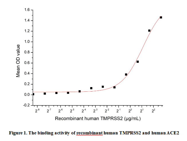 Transmembrane Protease, Serine 2 (TMPRSS2) is a type II transmembrane serine protease widely expressed in epithelial tissues, especially in the respiratory and gastrointestinal tracts. It plays critical roles in physiological processes like proprotein activation and tissue remodeling. Importantly, TMPRSS2 mediates viral entry by cleaving viral spike proteins, making it a key host factor in viral infections. TMPRSS2 binds to ACE2, facilitating the activation and entry of certain viruses into host cells.Thus a functional ELISA assay was conducted to detect the interaction of recombinant human TMPRSS2 and recombinant human ACE2. Briefly, TMPRSS2 was diluted serially in PBS with 0.01% BSA (pH 7.4). Duplicate samples of 100 μl were then transferred to ACE2-coated microtiter wells and incubated for 1h at 37℃. Wells were washed with PBST and incubated for 1h with anti-TMPRSS2 pAb, then aspirated and washed 3 times. After incubation with HRP labelled secondary antibody for 1h at 37℃, wells were aspirated and washed 5 times. With the addition of substrate solution, wells were incubated 15-25 minutes at 37℃. Finally, add 50 µL stop solution to the wells and read at 450/630nm immediately. The binding activity of recombinant human TMPRSS2 and recombinant human ACE2 was shown in Figure 1, the EC50 for this effect is 2.14076µg/mL.