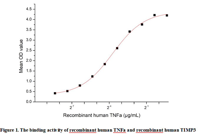 Tumor Necrosis Factor Alpha (TNFa) is a pro-inflammatory cytokine primarily produced by activated macrophages and immune cells. It plays a pivotal role in regulating inflammation, immune responses, and apoptosis. TNFa binds to its receptors (TNFR1/2), triggering signaling pathways such as NFkB and MAPK, which influence cell survival, proliferation, and cytokine production. Dysregulation of TNFa is associated with autoimmune diseases , cancer, and metabolic disorders.TNFa can interact with TIMP3, which inhibits TNFa-converting enzyme (TACE), thereby reducing TNFa release and modulating inflammation.Thus a functional binding ELISA assay was conducted to detect the interaction of recombinant human TNFa and recombinant human TIMP3 . Briefly, biotin-linked TNFa were diluted serially in PBS, with 0.01% BSA (pH 7.4). Duplicate samples of 100µl were then transferred to TIMP3-coated microtiter wells and incubated for 1h at 37℃. Wells were washed with PBST 3 times and incubation with Streptavidin-HRP for 30min, then wells were aspirated and washed 5 times. With the addition of substrate solution, wells were incubated 15-25 minutes at 37℃. Finally, add 50µl stop solution to the wells and read at 450nm immediately. The binding activity of TNFa and TIMP3 was shown in Figure 1, the EC50 for this effect is 0.076 µg/mL.