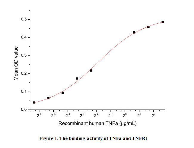 Tumor Necrosis Factor Alpha (TNFa), also known as TNF-α, is a potent pro-inflammatory cytokine that plays a central role in the body's immune response, cell survival, and apoptosis. It is primarily produced by activated macrophages, but also by other cell types including lymphocytes, neutrophils, and endothelial cells. TNFa exists in two forms: a transmembrane precursor and a soluble cytokine, both of which are biologically active and mediate their effects by binding to its receptors, TNFR1 and TNFR2.Its functions are diverse and crucial. In its beneficial role, TNFa helps orchestrate the inflammatory response to combat infections and can induce the death of tumor cells, which is the origin of its name. It is essential for the proper functioning of the immune system. However, TNFa is a classic "double-edged sword." Dysregulated or excessive production of TNFa is a key driver of pathological inflammation and is heavily implicated in the pathogenesis of a wide range of autoimmune and chronic inflammatory diseases, such as rheumatoid arthritis, inflammatory bowel disease (Crohn's disease), and psoriasis. Consequently, TNFa has become a major therapeutic target, and drugs that inhibit its action (e.g., infliximab, adalimumab) are widely used to treat these conditions, highlighting its profound clinical significance.To detect the activity of recombinant TNFa, a functional ELISA assay was performed to evaluate the interaction between recombinant mouse TNFa and recombinant human TNFR1.Briefly, biotin-linked TNFa were diluted serially in PBS, with 0.01% BSA (pH 7.4). Duplicate samples of 100µl were then transferred to TNFR1-coated microtiter wells and incubated for 1h at 37℃. Wells were washed with PBST 3 times and incubation with Streptavidin-HRP for 30min, then wells were aspirated and washed 5 times. With the addition of substrate solution, wells were incubated 15-25 minutes at 37℃. Finally, add 50µl stop solution to the wells and read at 450nm immediately. The binding activity of TNFa and TNFR1 was shown in Figure 1, the EC50 for this effect is 0.26852µg/mL.