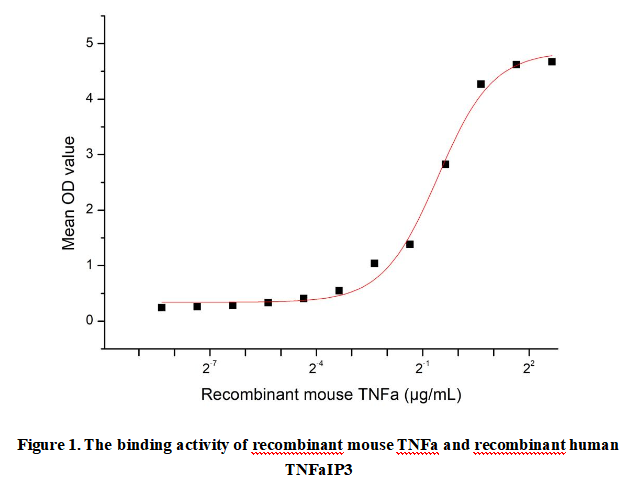Tumor Necrosis Factor Alpha (TNFa) is a pleiotropic pro-inflammatory cytokine primarily produced by macrophages and lymphocytes. As a key mediator of systemic inflammation, it binds to TNF receptors (TNFR1/R2) to activate NF-κB and MAPK pathways, regulating immune responses, cell survival, and apoptosis. Clinically, TNFa is implicated in autoimmune diseases and anti-tumor therapies, with its inhibitors widely used clinically. TNFa interacts directly with TNFaIP3, an ubiquitin-editing enzyme that terminates TNFa-induced NF-κB activation through deubiquitination, forming a critical negative feedback loop to control excessive inflammation.Thus a functional binding ELISA assay was conducted to detect the interaction of recombinant mouse TNFa and recombinant human TNFaIP3 .Briefly, biotin-linked TNFa were diluted serially in PBS, with 0.01% BSA (pH 7.4). Duplicate samples of 100µl were then transferred to TNFaIP3-coated microtiter wells and incubated for 1h at 37℃. Wells were washed with PBST 3 times and incubation with Streptavidin-HRP for 30min, then wells were aspirated and washed 5 times. With the addition of substrate solution, wells were incubated 15-25 minutes at 37℃. Finally, add 50µl stop solution to the wells and read at 450nm immediately. The binding activity of recombinant mouse TNFa and recombinant human TNFaIP3 was shown in Figure 1, the EC50 for this effect is 0.67 µg/mL.