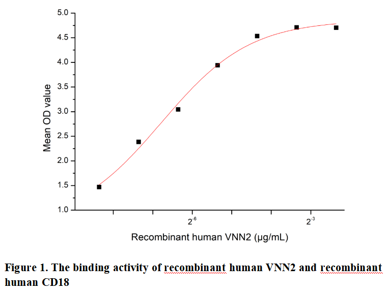 Vanin-2 (VNN2) is a glycosylphosphatidylinositol (GPI)-anchored ectoenzyme that plays crucial roles in inflammation and oxidative stress responses. As a member of the vanin family, it exhibits pantetheinase activity, converting pantetheine into cysteamine and pantothenic acid (vitamin B5). VNN2 is highly expressed in immune cells, particularly neutrophils, where it modulates cellular adhesion and migration during inflammatory processes. Recent studies highlight its involvement in neutrophil recruitment to inflammatory sites and its potential as a biomarker for various inflammatory diseases. The enzyme's activity influences glutathione metabolism, thereby regulating redox homeostasis in immune responses.Besides,VNN2 directly binds to Integrin Beta 2 (CD18) on leukocytes, facilitating their adhesion and transendothelial migration during inflammation.Thus a functional binding ELISA assay was conducted to detect the interaction of recombinant human VNN2 and recombinant human CD18. Briefly, VNN2 was diluted serially in PBS with 0.01% BSA (pH 7.4). Duplicate samples of 100 μl were then transferred to CD18-coated microtiter wells and incubated for 1h at 37℃. Wells were washed with PBST and incubated for 1h with anti-VNN2 pAb, then aspirated and washed 3 times. After incubation with HRP labelled secondary antibody for 1h at 37℃, wells were aspirated and washed 5 times. With the addition of substrate solution, wells were incubated 15-25 minutes at 37℃. Finally, add 50 µL stop solution to the wells and read at 450/630nm immediately. The binding activity of recombinant human VNN2 and recombinant human CD18 was shown in Figure 1, the EC50 for this effect is 0.009 µg/mL.